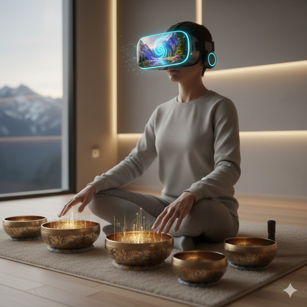 Le concept : Une immersion totale où les vibrations physiques des bols détendent le corps, tandis que les visuels 360° du casque apaisent instantanément le mental.